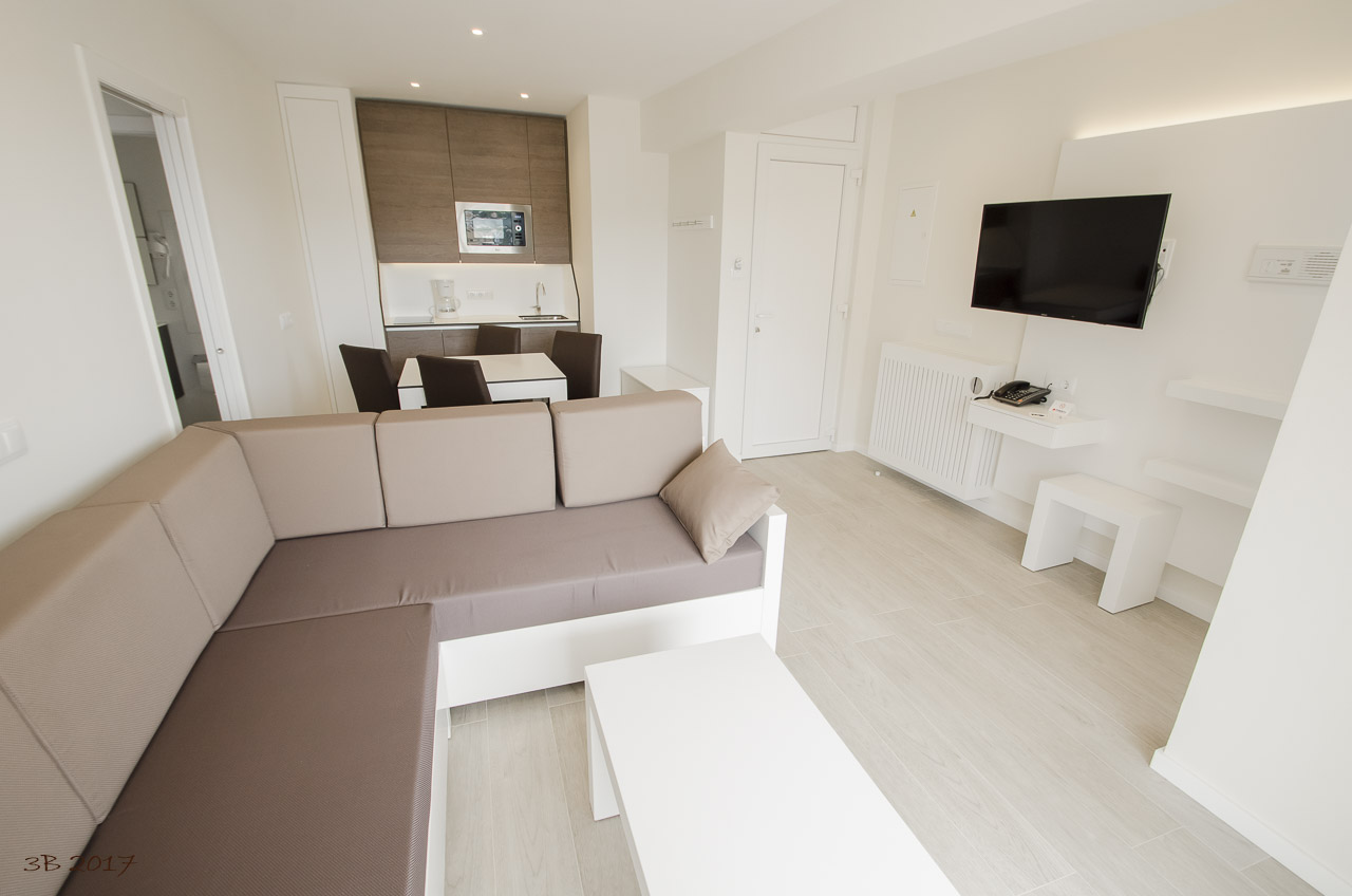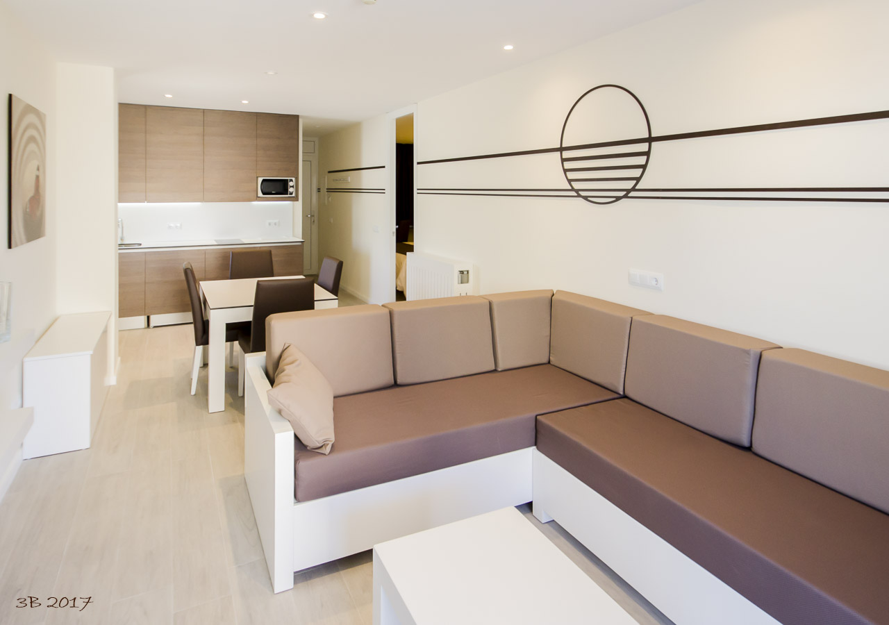 Si buscas un apartamento en la playa de Paguera con todas las comodidades, Apartamentos Ponent es la elección perfecta. Ubicados a pocos pasos del mar, nuestros 55 apartamentos de 45 m² ofrecen un espacio amplio y funcional para que disfrutes de unas vacaciones inolvidables. Todas las unidades cuentan con una habitación luminosa con camas individuales, televisor de 32 pulgadas con canales satélite, armario empotrado y caja fuerte para tu tranquilidad. La sala de estar dispone de un televisor de 40 pulgadas, zona de comedor y una cocina completamente equipada con microondas, nevera, tostadora, hervidor y cafetera. Además, cada apartamento tiene una amplia terraza exterior con mobiliario, perfecta para relajarte después de un día de playa.